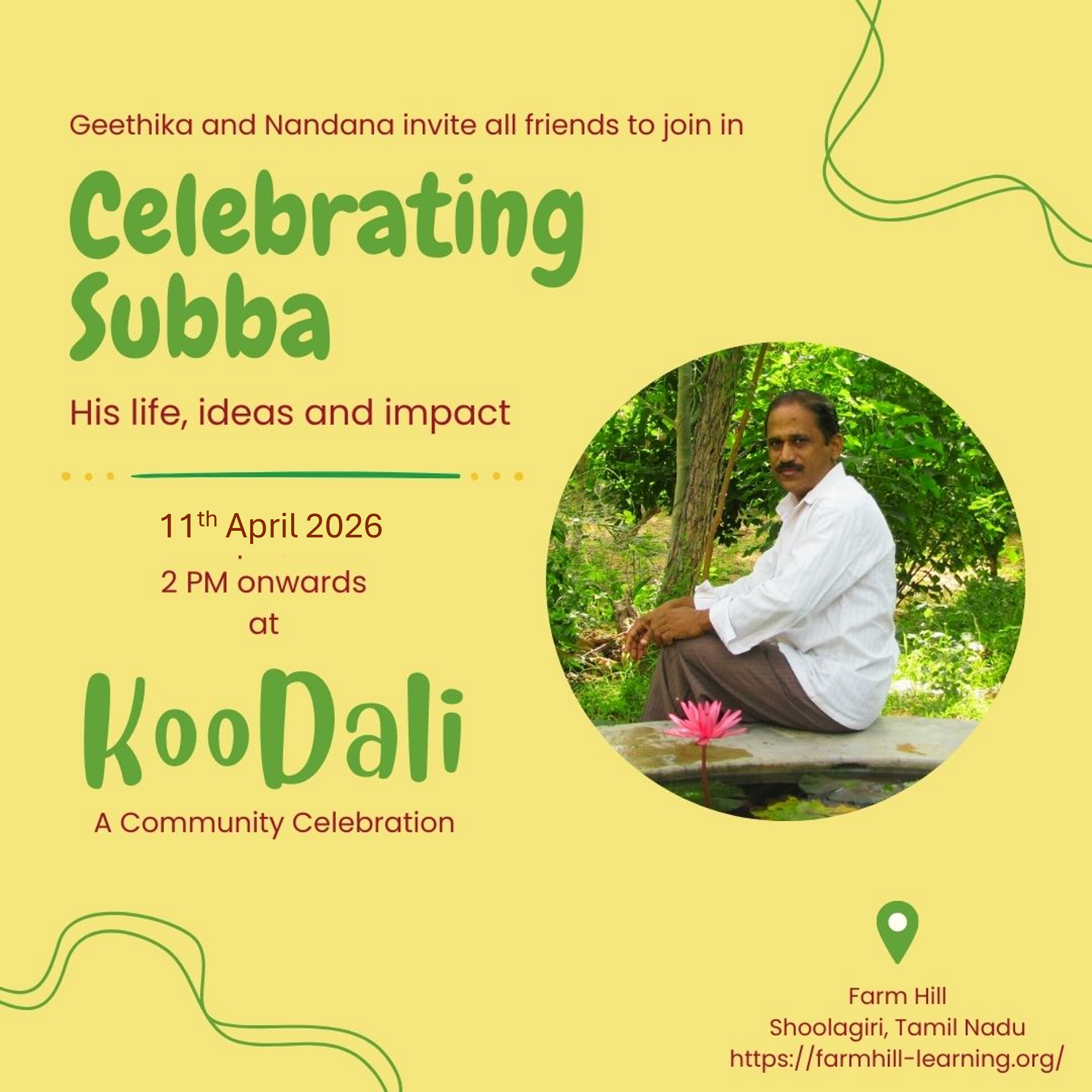 Subba was our friend, guide and philosopher, and in many ways the inspiration for the Farm Hill community. We will be celebrating his life and legacy in this event. We will be sharing stories, memories and reflections about Subba, and how his teachings and presence have shaped not only our community but also a number of friends. We will also be sharing some of the things that we have learned from Subba, and how we can continue to carry forward his vision and values in our lives and work.